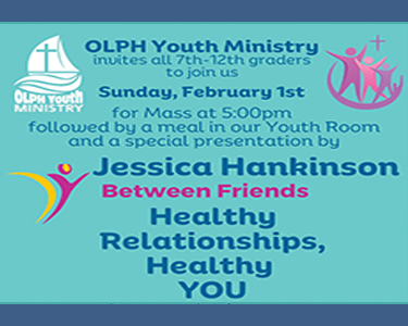 Healthy Relationships, Healthy YOU 5:00pm Sunday, Feb. 1. All 7th -12th Graders are invited to Mass, a meal, and a special presentation by Jessica Hankinson. Image Event date Sun, Feb 1 2026, 5 - 8pm